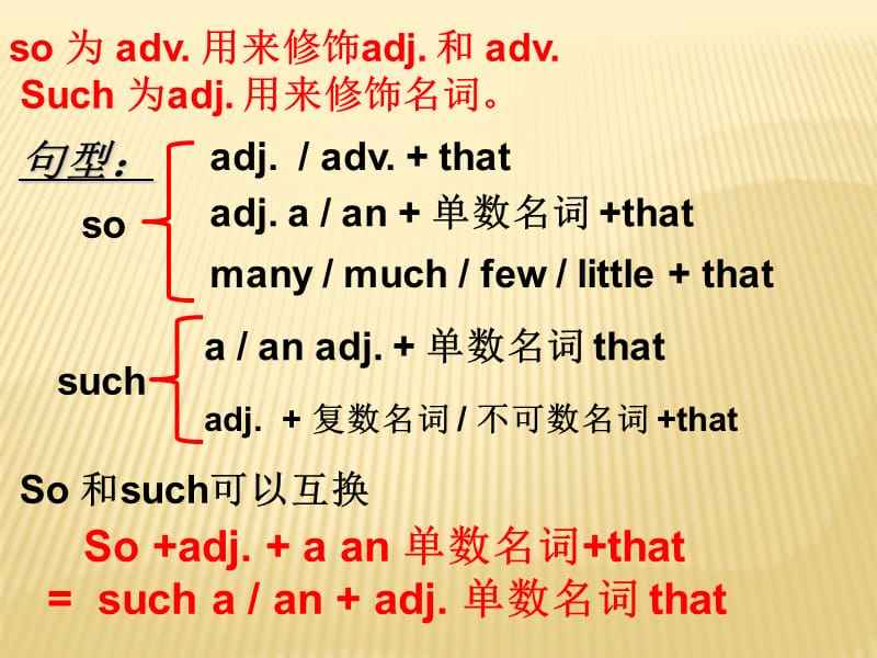 1.such其后被修饰的中心词为名词(此名词前可有形容词修饰)。so其后被修饰的中心词为形容词或副词。 2.名词用many, much, few或little等修饰时,不能用such来修饰,而应用so。 3.so是副词,修饰形容词和副词;而such是形容词,修饰名词。它们后面都接单数可数名词,但词序不同。 4.so的词序为:so+adj.+a(an)+n. 5.such的词序为:such+a(an)+adj.+n. 6.和that连用时,意思基本一样,但句型结构不同。so...that...句型结构为: (1)so+adj.(adv.)+that... (2)so+adj.+a(an)+单数名词+that... (3)so+many(few)+复数名词+that... (4)so+much(little)+不可数名词+that... 7.so与that可以直接构成词组so that,引导目的状语从句和结果状语从句,表示“以便、以至”的意思。